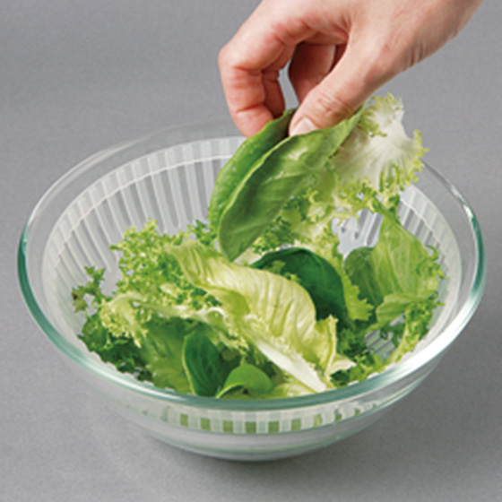 耐熱ガラス製サラダボウルが、サラダスピナーに変身!