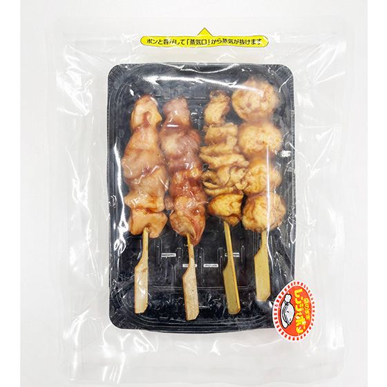 | 原材料 | 【焼き鳥串(もも串、とりトロ(肩肉)串)】鶏肉(九州産)、タレ(醤油、砂糖、水飴、みりん、アミノ酸液、食塩、りんご酢、香辛料)/増粘剤(加工でん粉、キサンタン)、カラメル色素、ベニコウジ色素、(一部に小麦・大豆・鶏肉・りんごを含む)【焼き鳥串(皮串)】鶏皮(九州産)、タレ(醤油、砂糖、水飴、みりん、アミノ酸液、食塩、りんご酢、香辛料)/増粘剤(加工でん粉、キサンタン)、カラメル色素、ベニコウジ色素、(一部に小麦・大豆・鶏肉・りんごを含む)【焼き鳥串(つくね串)】鶏つくね(鶏肉(九州産)、玉葱(国産)、粒状大豆たん白、つなぎ(でん粉、パン粉)、鶏皮(九州産)、豚脂、醤油、食塩、発酵調味料、砂糖)、タレ(醤油、砂糖、水飴、みりん、アミノ酸液、食塩、りんご酢、香辛料)/調味料(アミノ酸等)、増粘剤(加工でん粉、キサンタン)、リン酸塩(Na,K)、カラメル色素、ベニコウジ色素、酸味料、(一部に小麦・大豆・鶏肉・豚肉・りんごを含む) |