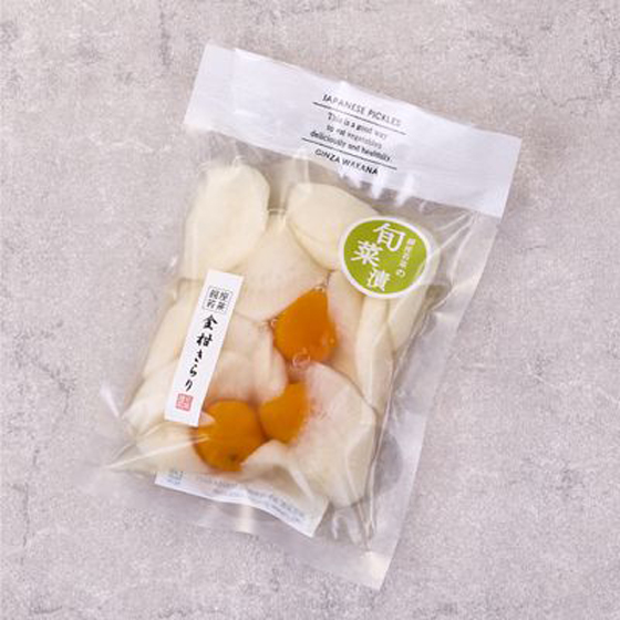 | 原材料 | 大根(国産)、金柑蜂蜜漬[(金柑、果糖ぶどう糖液糖、はちみつ)国産]漬け原材料[グラニュー糖、りんご酢、米酢、食塩]/酸化防止剤(ビタミンC)、(一部にりんごを含む) |