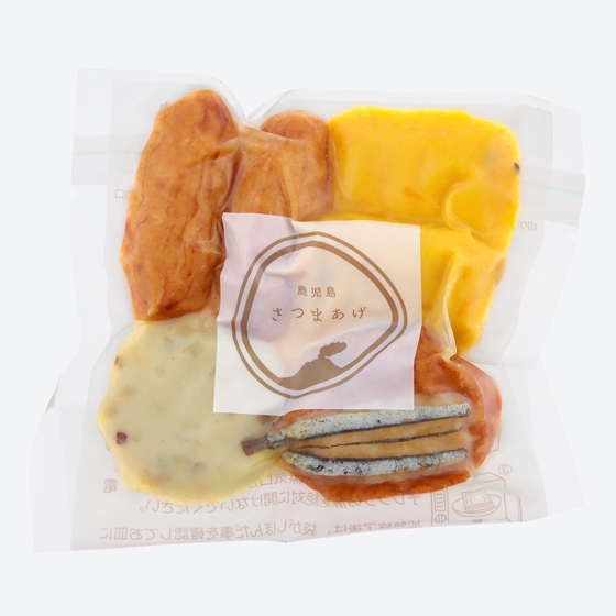 | 原材料 | 魚肉(イトヨリダイ(ベトナム、タイ)、とび魚、スケトウダラ、その他)、でん粉、かぼちゃペースト、砂糖、かぼちゃ、卵白、生姜、きびなご、米発酵調味料、食塩、さつま芋、豆腐、灰持酒(薩摩地酒)、山芋、お茶粉、菜種油/調味料(アミノ酸等)、保存料(ソルビン酸(K))、(一部に卵・大豆・やまいもを含む) |