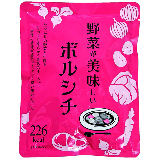| 原材料 | 野菜(キャベツ(国産)、じゃがいも、にんじん、玉ねぎ)、牛肉、トマトペースト、でん粉、砂糖、チキンブイヨンパウダー、なたね油、生クリーム、ビーツ水煮、醸造酢、香辛料、蛋白加水分解物、酵母エキス/カラメル色素、(一部に小麦・乳成分・大豆・牛肉・鶏肉を含む) |