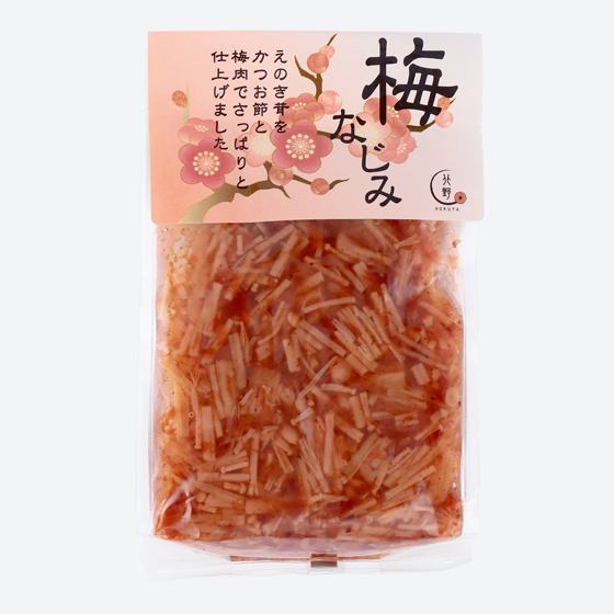 | 原材料 | えのき茸加工品(えのき茸(国産)、食塩)、水飴、蛋白加水分解物(小麦を含む)、りんごピューレ、梅肉(梅(国産)、食塩)、砂糖、かつお節(かつお(国産))、食塩/酸味料、調味料(アミノ酸等)、ラック色素、増粘多糖類 |