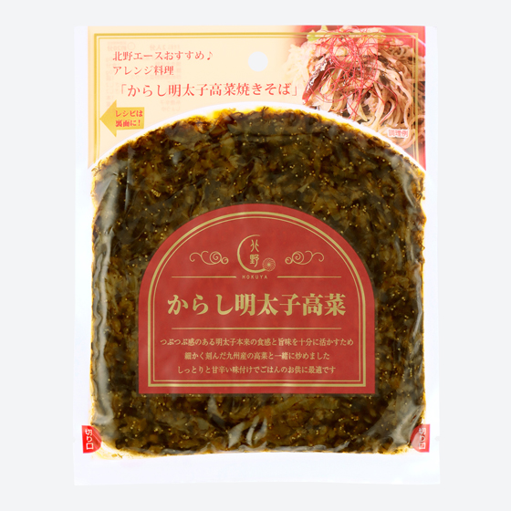 | 原材料 | 高菜(国産)、バラコめんたいこ、植物油(大豆を含む)、糖類(砂糖、砂糖混合ぶどう糖果糖液糖、水あめ)、しょうゆ(小麦を含む)、発酵調味料、食塩、魚介エキス(かつお、いわし、さば、その他)、香辛料、キムチ風調味料、ウコン粉、醸造酢、たん白加水分解物/調味料(アミノ酸等)、酸味料、甘味料(D-ソルビトール)、パプリカ色素、香辛料抽出物 |