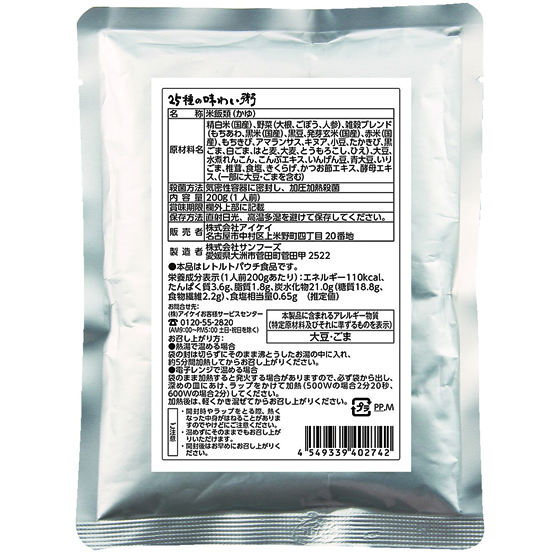 | 原材料 | 精白米(国産)、野菜(大根、ごぼう、人参)、雑穀ブレンド(もちあわ、黒米(国産)、黒豆、発芽玄米(国産)、赤米(国産)、もちきび、アマランサス、キヌア、小豆、たかきび、黒ごま、白ごま、はと麦、大麦、とうもろこし、ひえ)、大豆、水煮れんこん、こんぶエキス、いんげん豆、青大豆、いりごま、椎茸、食塩、きくらげ、かつお節エキス、酵母エキス、(一部に大豆・ごまを含む) |