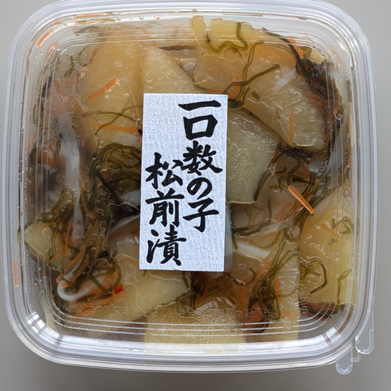 | 原材料 | 塩数の子(鰊の卵(アメリカ産)、食塩)、醤油(小麦・大豆を含む)、昆布、砂糖、人参、水飴、するめ(いかを含む)、醸造酢、発酵調味料、還元水飴、唐辛子/調味料(アミノ酸等)、増粘剤(キサンタン)、ソルビット、酵素、パプリカ色素、香料、甘味料(ステビア) |