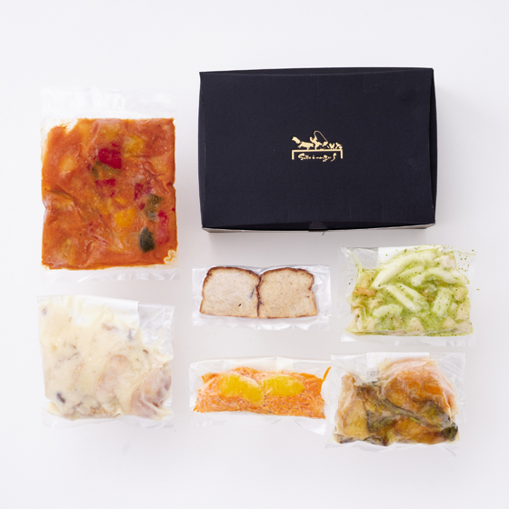 | 原材料 | [お魚のエスカベッシュ スパイス香味]近海魚(シイラ、サワラ)、玉葱、人参、穀物酢、オリーブオイル、小麦粉、片栗粉、薄口醤油、カレー粉、砂糖、塩、胡椒、(一部に大豆・小麦を含む)[柑橘風味のキャロットラぺ]人参、食用オリーブ油、米酢、玉葱、にんにく、粒マスタード、オレンジ、はちみつ、食塩、胡椒、(一部にオレンジを含む)[近海魚とオリーブのケークサレ]牛乳(国内製造)、卵、小麦粉、グラナバダーノ、にんにくピューレ、オリーブペースト、近海魚(サーモン、スズキ)、食用オリーブ油、塩/ベーキングパウダー、(一部に小麦・乳成分・卵を含む)[ラタトゥイユ]トマトピューレ、赤ピーマン、黄ピーマン、ズッキーニ、にんにく、オリーブ油[小海老と小柱のジェノベーゼ]小海老、小柱、いか、玉葱、バジルペースト(食用オリーブ油、バジル、にんにく、なたね油、食塩)、(一部にえびを含む)[鶏肉と茸のフリカッセ]鶏肉(京都府産)、日本酒、ホワイトソース(牛乳、バター、小麦粉)、生クリーム、玉ねぎ、しめじ、食用ひまわり油、食用オリーブ油、塩、胡椒、(一部に乳成分・小麦を含む) |