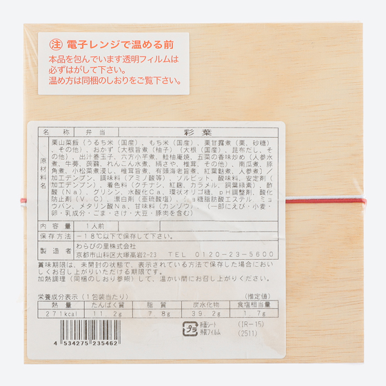 | 原材料 | 栗山菜飯{うるち米(国産)、もち米(国産)、栗甘露煮(栗、砂糖)、その他}、おかず〔大根旨煮(柚子){大根(国産)、昆布だし、その他}、出汁巻玉子、六方小芋煮、鮭柚庵焼、五菜の香味炒め(人参水煮、牛蒡、蒟蒻、れんこん水煮、絹さや、椎茸、その他)、南瓜煮、豚角煮、小松菜煮浸し、椎茸旨煮、有頭海老旨煮、紅葉麩煮、人参煮〕/加工デンプン、調味料(アミノ酸等)、ソルビット、酸味料、安定剤(加工デンプン)、着色料(クチナシ、紅麹、カラメル、銅葉緑素)、酢酸(Na)、グリシン、水酸化Ca、環状オリゴ糖、pH調整剤、酸化防止剤(V.C)、漂白剤(亜硫酸塩)、ショ糖脂肪酸エステル、ミョウバン、メタリン酸Na、甘味料(カンゾウ)、(一部にえび・小麦・卵・乳成分・ごま・さけ・大豆・豚肉を含む) |