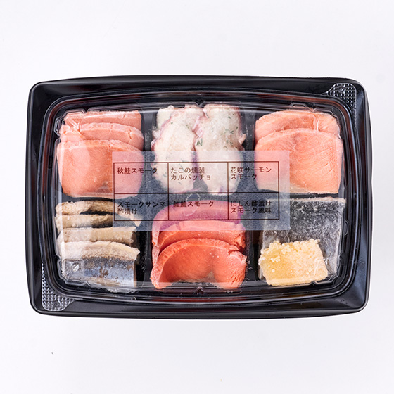 | 原材料 | たこスモークオイル漬け(やなぎだこ(北海道産)、食用オリーブ油、食用ぶどう油、食塩、ディル)、さんま酢漬けスモーク(さんま(北海道産)、穀物酢、砂糖、食塩、香辛料)、にしん酢漬けスモーク(にしん(北海道産)、にしんの卵、穀物酢、砂糖、食塩、ワインビネガー、香辛料)、秋鮭スモーク(しろさけ(北海道産)、食塩、チキエンエキス、香辛料)、トラウトサーモンスモーク(トラウトサーモン(北海道産)、食塩、チキンエキス、香辛料)、紅鮭スモーク(紅鮭(ロシア産)、食塩、チキンエキス、香辛料)/調味料(アミノ酸等)、くん液、酸化防止剤(ビタミンC)、(一部に小麦・さけ・鶏肉を含む) |