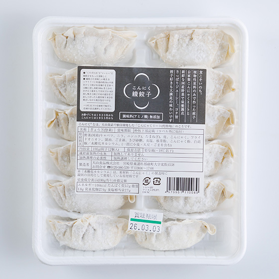 | 原材料 | 野菜(国産(キャベツ、ニラ、ニンニク)、たまねぎ)、皮、こんにゃく、フライドオニオン、馬鈴薯でん粉、醤油、ごま油、きび砂糖、食塩、椎茸粉、白胡椒、こんにゃく粉/水酸化カルシウム、(一部に小麦・大豆・ごまを含む) |