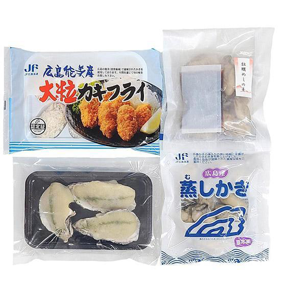 | 原材料 | 【広島産かきの牡蠣めしの素】かき(広島県産)、調味料〔砂糖(国内製造)、食塩、水飴、醤油、酵母エキス、魚介エキス/調味料(アミノ酸等)、カラメル色素、酸味料、(一部に小麦・乳成分・大豆を含む)〕【広島能美産大粒かきフライ】かき(広島県産)、衣(パン粉、小麦粉、粉末植物油脂、コーンスターチ、全紛乳、食塩、香辛料)/加工デンプン、調味料(アミノ酸等)、増粘多糖類、香辛料抽出物、(一部に小麦・乳成分・大豆を含む)【広島県産殻付きかきグラタン】かき(広島県産)、牛乳(国内製造)、小麦粉、たまねぎ、生クリーム、無塩バター、脱脂粉乳、食塩、砂糖、酵母エキス、コーングリッツ、香辛料/増粘剤(加工でん粉)、(一部に小麦・乳成分を含む)【広島県産冷凍蒸しかき】かき(広島県産) |