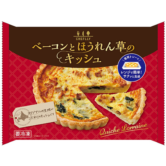 | 原材料 | 小麦粉(国内製造)、液卵、マーガリン、オニオンソテー、乳等を主要原料とする食品、牛乳、ほうれん草、ベーコン、ナチュラルチーズ、食塩、香辛料/増粘剤(加工デンプン)、酒精、安定剤(タマリンドガム)、酸化防止剤(ビタミンC)、香料、着色料(アナトー)、(一部に小麦・卵・乳成分・大豆・豚肉を含む) |