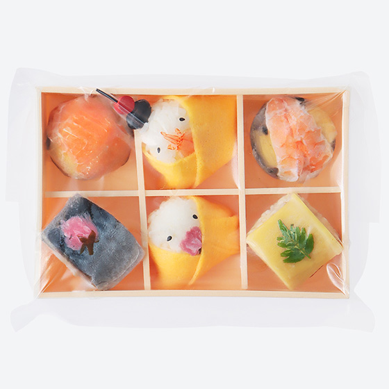 | 原材料 | 米(国産)、調味酢、玉子焼、しめさば、たけのこ煮、えび、サーモントラウト、寿司具(干瓢、椎茸、その他)、桜の花塩漬、わさび葉、黒豆、うり粕漬け、わさび茎、わさび粉、食用乳化油脂、ごま、木の芽、つゆ/トレハロース、pH調整剤、調味料(アミノ酸等)、着色料(カラメル、クチナシ)、香料、ビタミンC、増粘剤(ローカスト)、ソルビット、酒精、炭酸Ca、(一部に小麦・卵・えび・ごま・さけ・さば・大豆を含む) |