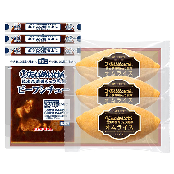 | 原材料 | オムライス:液卵(国内製造)、米(国産)、野菜(たまねぎ(国産)、にんじん(国産))、トマトケチャップ、鶏肉(国産)、植物油脂(大豆を含む)、ぶどう糖果糖液糖、還元水あめ、バター(乳成分を含む)、砂糖、食塩、肉エキス(鶏肉・豚肉を含む)、トマトペースト、チキンコンソメ(小麦・乳成分・大豆・鶏肉・ゼラチンを含む)、酢、脱脂粉乳、こしょう/加工でん粉(小麦由来)、トレハロース ビーフシチュー:デミグラスソース(小麦・乳成分・牛肉・大豆・鶏肉・豚肉を含む)(国内製造)、牛肉、デミグラスソースベース(牛肉・鶏肉を含む)、たまねぎ、フォンドヴォー(牛肉を含む)、ワイン、植物油脂、ビーフシーズニングエキス(小麦・大豆・鶏肉・豚肉を含む)、トマトペースト、はちみつ、しょうゆ(小麦・大豆を含む)、にんじん、みりん、砂糖、調味油(牛肉を含む)、バター(乳成分を含む)、ミルポワパウダー(鶏肉を含む)、食塩、酒、香辛料、酵母エキス、デキストリン、たん白加水分解物(小麦を含む)、脱脂粉乳、乾燥卵白(卵を含む)/カラメル色素、増粘剤(加工でん粉、キサンタン)、調味料(アミノ酸等)、リン酸塩(Na)、香料(大豆・鶏肉由来)、酸味料 |