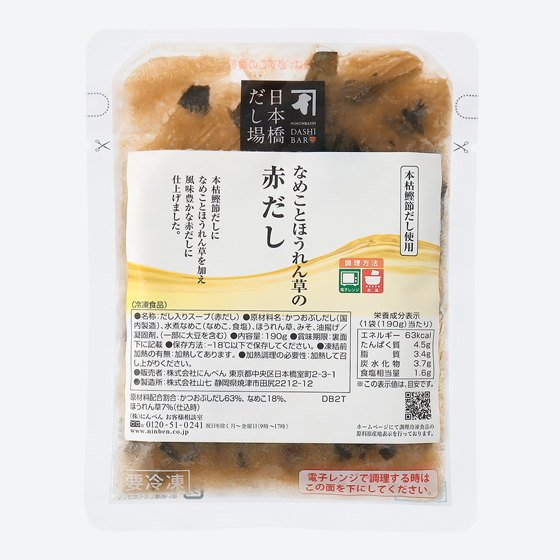 | 原材料 | かつおぶしだし(国内製造)、水煮なめこ(なめこ、食塩)、ほうれん草、みそ、油揚げ/凝固剤、(一部に大豆を含む) |