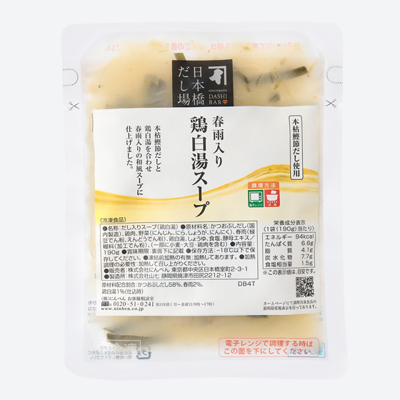 | 原材料 | かつおぶしだし(国内製造)、鶏肉、野菜(にんじん、にら、しょうが、にんにく)、春雨(緑豆でん粉、えんどうでん粉)、鶏白湯、しょうゆ、食塩、酵母エキス/糊料(加工でん粉)、(一部に小麦・大豆・鶏肉を含む) |