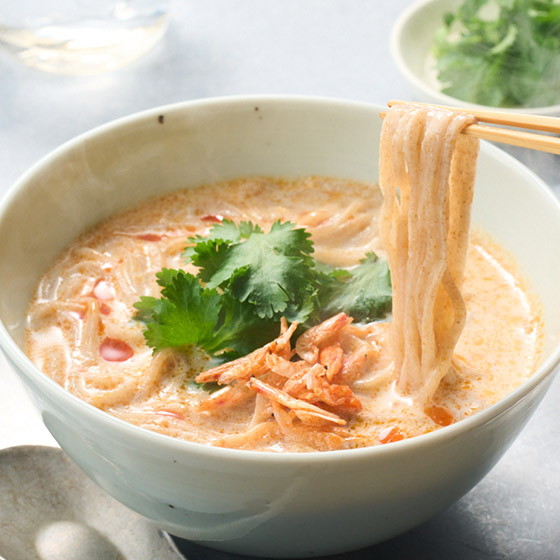 | 原材料 | 「めん」小麦粉(国内製造)、小麦全粒粉、食塩、小麦グルテン/酒精、加工でん粉、乳酸ナトリウム、(一部に小麦を含む) 「スープ」なたね油(国内製造)、しょうゆ、食塩、チキンエキス、たん白加水分解物、醸造調味料、香味食用油、砂糖、酵母エキス、魚醤(魚介類)、醸造酢、しいたけエキス、ごぼう粉末、香辛料/加工でんぷん、酒精、香辛料抽出物、カロチノイド色素、香料、(一部にえび・小麦・ごま・大豆・鶏肉・りんご・魚醤(魚介類)を含む) 「豆乳」大豆(国産) |