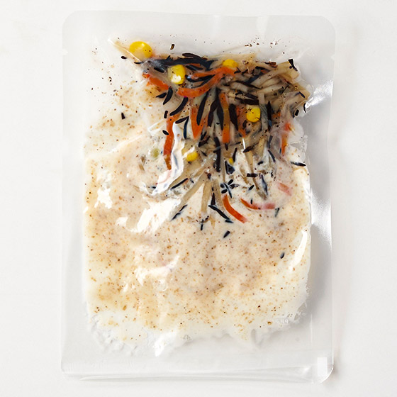 | 原材料 | ごぼう(国産)、半固体状ドレッシング(食用植物油脂、醸造酢、砂糖、加糖卵黄、たんぱく加水分解物、食塩、鶏卵加工品、香辛料)、麦芽水あめ、人参、とうもろこし、三温糖、枝豆、ひじき、すりごま、昆布だし、かつおだし、食塩、梅酢、酵母エキス、唐辛子/酵素、(一部に卵・大豆・ごまを含む) |