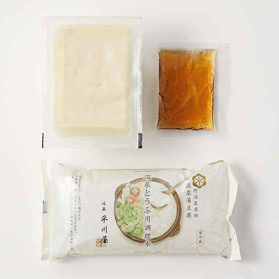 | 原材料 | 温泉とうふ[大豆(佐賀県産)/凝固剤(粗製海水塩化マグネシウム)]、調理水[水/pH調整剤]、白だし[食塩、砂糖、たん白加水分解物、しょうゆ、昆布エキス、魚介エキス、かつおぶし、昆布/調味料(アミノ酸等)、(一部に小麦・大豆を含む)] |