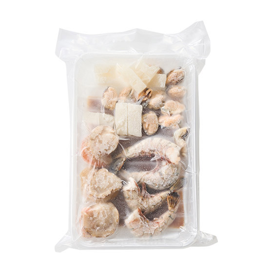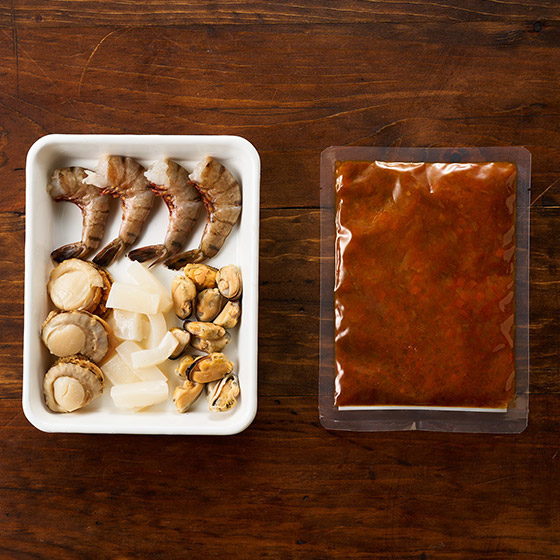 | 原材料 | 具材【ほたて(国産)、養殖ブラックタイガー(ミャンマー産)、アカイカ、ムール貝】、スープ【たまねぎ(国産)、にんじん、セロリ、醤油、こめ油、トマトペースト、ホタテエキス、ワイン、砂糖、にんにく、あさりエキス、えびエキス、ターメリック、パプリカ粉末、でん粉、食塩、えび粉末、胡椒、セロリエキス、濃縮レモン果汁、香辛料】、(一部にえび・いか・小麦・大豆を含む) |