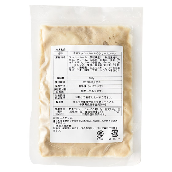| 原材料 | マッシュルーム(茨城県産)、加工乳(国内製造)、玉ねぎ(国産)、乳等を主要原料とする食品、ルー(小麦粉、バター)、バター、チキンコンソメ、食塩、小麦粉、香辛料/乳化剤、増粘剤(加工でん粉)、(一部に乳成分・小麦・鶏肉・ゼラチンを含む) |