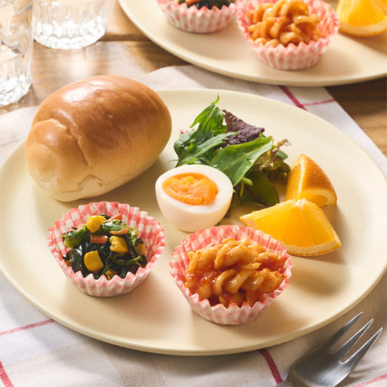 | 原材料 | ほうれん草バター炒め:野菜(ほうれん草(国産)、とうもろこし、にんじん)、バター、ベーコン、大豆油、食塩、こしょう/香辛料抽出物、(一部に卵・乳成分・大豆・豚肉を含む)、マカロニソースかけ(調理済み):マカロニ(国内製造)、トマトペースト、たまねぎ、なたね油、砂糖、でん粉、トマトケチャップ、小麦粉、ウスターソース、食塩、ポークエキス、米粉、粉末ブイヨン、ナチュラルチーズ、おろしにんにく、こしょう/着色料(カラメル)、(一部に小麦・乳成分・大豆・豚肉を含む) |