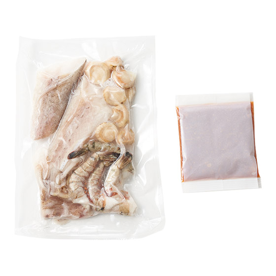 | 原材料 | 【シーフードミックス】助宗たら(アメリカ産)、養殖ブラックタイガー、ほたて、やりいか【濃縮スープ】醤油(国内製造)、トマトペースト、砂糖、ホタテエキス、玉葱、ワイン、オリーブオイル、アサリエキス、エビエキス、タイエキス、にんにく、でん粉、エビ粉末、醸造酢、セロリエキス、胡椒、ローレル、タイム、(一部に小麦・えび・大豆を含む) |