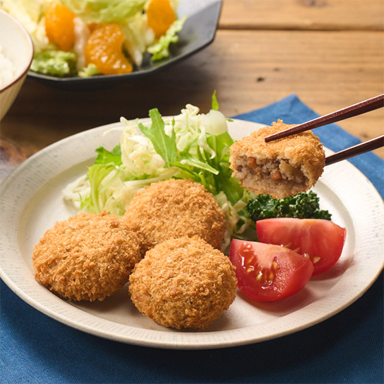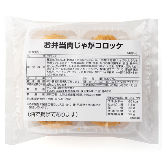 | 原材料 | 野菜{ばれいしょ(北海道)、たまねぎ、にんじん}、牛肉(北海道)、しょうゆ、しらたき、乾燥マッシュポテト、発酵調味料、砂糖、牛脂、かつお風味調味料、食塩、香辛料、衣(パン粉、小麦粉、加工油脂、植物油脂、粉末水あめ、大豆粉、粉末状大豆たん白)、揚げ油(パーム油、米ぬか油)/加工デンプン、糊料(加工デンプン)、増粘多糖類、乳化剤、ベーキングパウダー、水酸化Ca、(一部に小麦・牛肉・大豆を含む) |