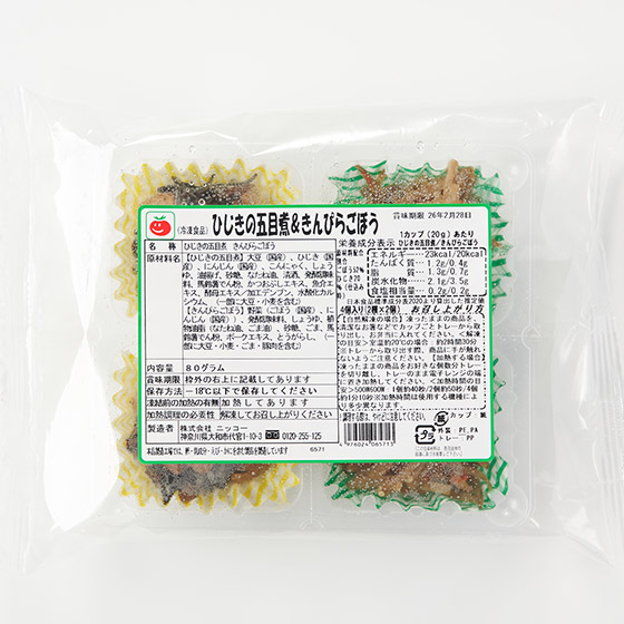 | 原材料 | 【ひじきの五目煮】大豆(国産)、ひじき(国産)、にんじん(国産)、こんにゃく、しょうゆ、油揚げ、砂糖、なたね油、清酒、発酵調味料、馬鈴薯でん粉、かつおぶしエキス、魚介エキス、酵母エキス/加工デンプン、水酸化カルシウム、(一部に大豆・小麦を含む) 【きんぴらごぼう】野菜(ごぼう(国産)、にんじん(国産))、発酵調味料、しょうゆ、植物油脂(なたね油、ごま油)、砂糖、ごま、馬鈴薯でん粉、ポークエキス、とうがらし、(一部に大豆・小麦・ごま・豚肉を含む) |