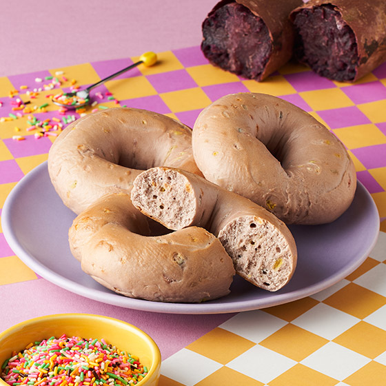 原材料 | 小麦粉(国内製造)、きび砂糖、カラースプレー、ムラサキイモパウダー、食塩、パン酵母/乳化剤、着色料(クチナシ、野菜色素、ウコン、カロチノイド)、香料、(一部に小麦・乳成分・大豆を含む) |