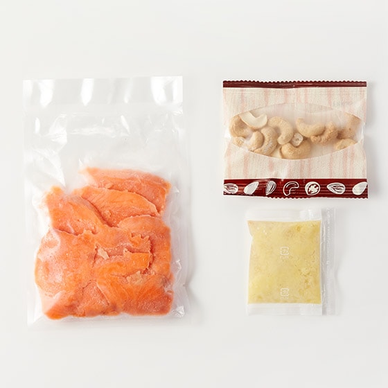 原材料 | 【サーモン切落し】サーモントラウト(チリ)、植物油/pH調整剤、酸化防止剤(ビタミンC,ビタミンE) 【カルダモンドレッシング】オリーブオイル(スペイン産)、食塩、マスタード、濃縮レモン果汁、カルダモン 【カシューナッツ】カシューナッツ(インド) |