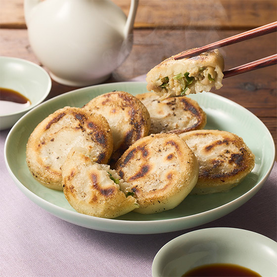 原材料 | 皮[小麦粉(小麦(国産))、ばれいしょでん粉、砂糖、ラード、食塩、大豆粉]、具[野菜(国産(にら、白菜、長ねぎ、にんにく、しょうが))、食肉(国産(鶏肉、豚肉))、豚脂(国産)、しょうゆ(大豆・小麦を含む)、ごま油、発酵調味料、食塩、砂糖、酵母エキス、こしょう]、打ち粉[でん粉]/加工デンプン |