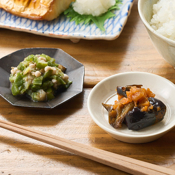 | 原材料 | 【オクラのおかか和え】オクラ(インドネシア)、しめじ、なたね油、かつお節エキス、かつお節、馬鈴薯でん粉、食塩 【茄子のケチャップ炒め】揚げ茄子(茄子(ベトナム)、食塩、揚げ油(パーム油))、野菜(にんじん(国産)、たまねぎ(国産)、にんにく(国産))、ケチャップ、砂糖、なたね油、馬鈴薯でん粉、酵母エキス |