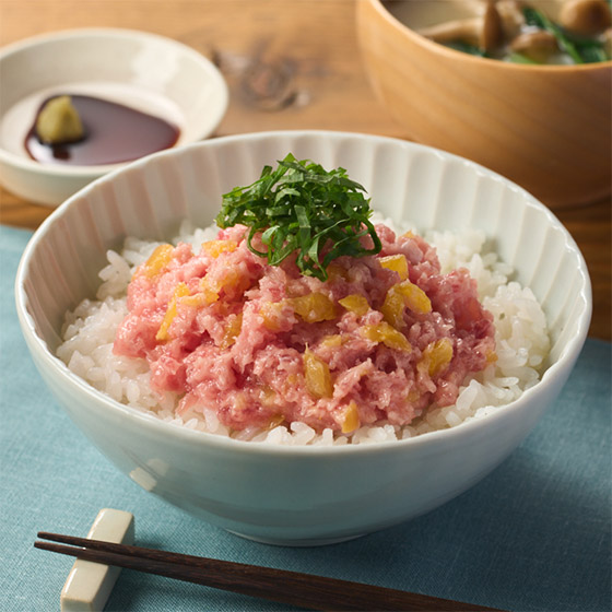 | 原材料 | 鮪(台湾または日本)、たくあん漬け(塩押しだいこん、漬け原材料〔アミノ酸液(小麦を含む)、砂糖、醸造酢、食塩、水あめ混合異性化液糖、米ぬか〕)、植物油/pH調整剤、調味料(アミノ酸等)、酸化防止剤(ビタミンC、ビタミンE)、着色料(ウコン)、酸味料、香辛料抽出物 |