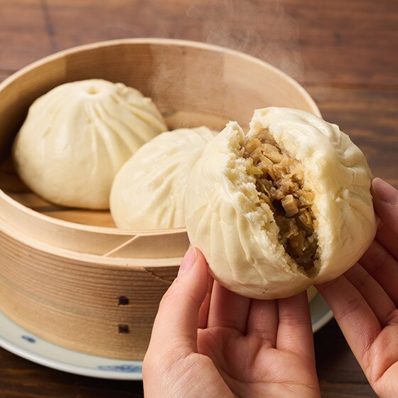 | 原材料 | 皮[小麦粉(小麦(国産))、砂糖、牛乳、ラード(豚肉を含む)、イースト、食塩]、具[野菜(国産(キャベツ、玉ねぎ、たけのこ、しょうが))、豚肉(国産)、いか(ペルー)、豚脂(国産)、しょうゆ(大豆・小麦を含む)、砂糖、ばれいしょでん粉、ごま油、魚醤(いかを含む)、発酵調味料、食塩、こしょう]、打ち粉[小麦粉(小麦(国産))]/膨張剤 |