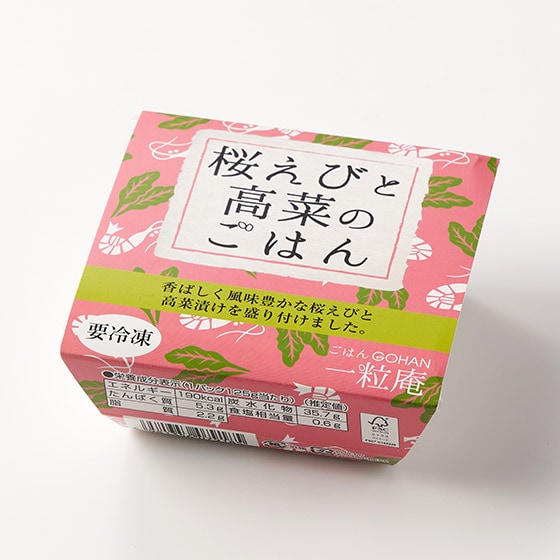 | 原材料 | 米(佐賀県産)、高菜塩漬〔高菜(国産)、食塩〕、桜えび(台湾産)、白ごま、植物油/カイワレエキス、(一部にえび・ごまを含む) |