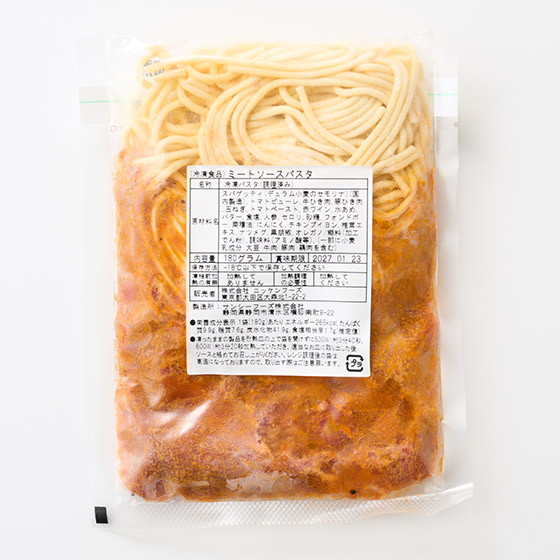 | 原材料 | スパゲッティ(デュラム小麦のセモリナ)(国内製造)、トマトピューレ、牛ひき肉、豚ひき肉、玉ねぎ、トマトペースト、赤ワイン、水あめ、バター、食塩、人参、セロリ、砂糖、フォンドボー、菜種油、にんにく、チキンブイヨン、椎茸エキス、ナツメグ、黒胡椒、オレガノ/糊料(加工でん粉)、調味料(アミノ酸等)、(一部に小麦・乳成分・大豆・牛肉・豚肉・鶏肉を含む) |