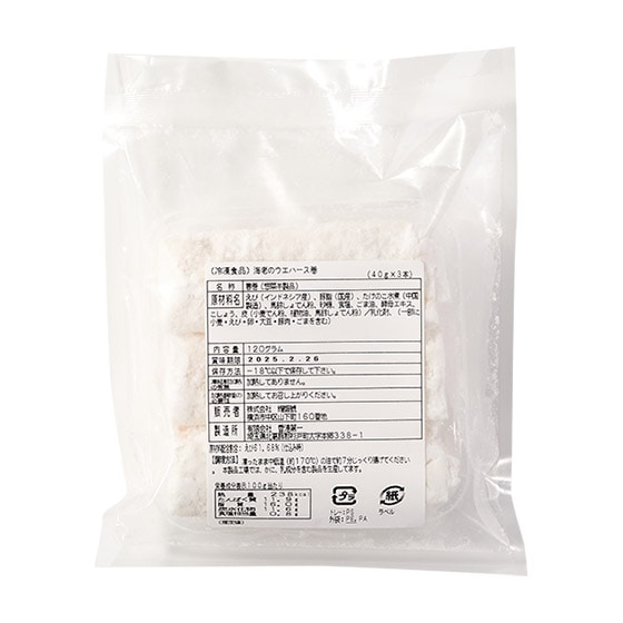 | 原材料 | えび(インドネシア産)、豚脂(国産)、たけのこ水煮、馬鈴しょでん粉、砂糖、食塩、ごま油、酵母エキス、こしょう、皮(小麦でん粉、植物油、馬鈴しょでん粉)/乳化剤、(一部に小麦・えび・卵・大豆・豚肉・ごまを含む) |