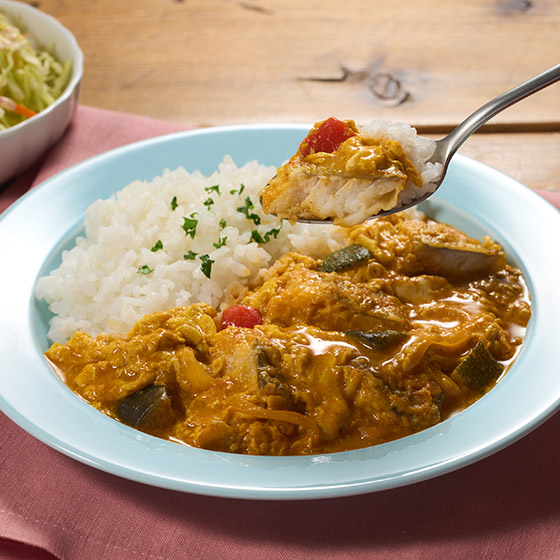 ■やさしい味付け!卵で仕上げる 白身魚と野菜のまろやかカレー