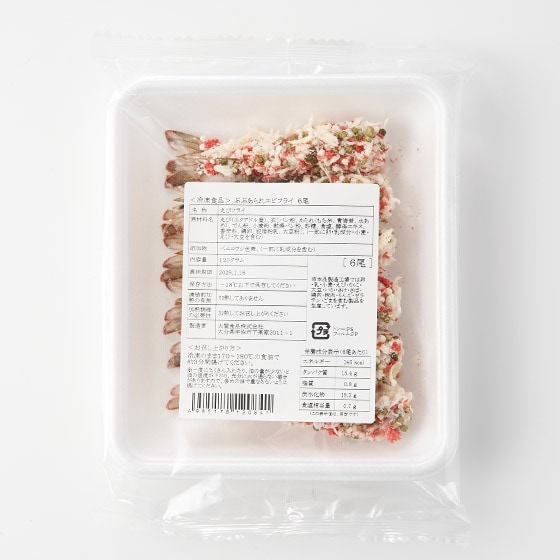 | 原材料 | えび(エクアドル産)、衣[パン粉、あられ(もち米、青海苔、水あめ)、でん粉、小麦粉、乾燥パン粉、砂糖、食塩、酵母エキス、香辛料、鶏卵、脱脂粉乳、大豆粉]/ベニコウジ色素、(一部に卵・乳成分・小麦・えび・大豆を含む) |
