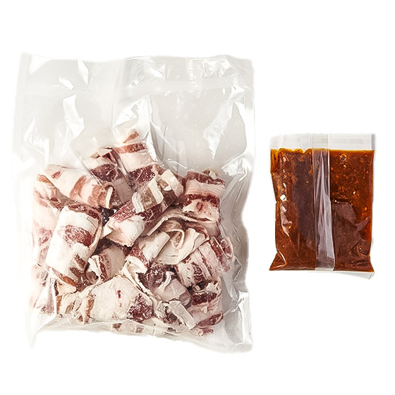 | 原材料 | 牛肉(米国産)、たれ【玉葱(国産)、醤油、砂糖、生姜、ごま油、醸造酢、にんにく、ごま、チキンエキス、味噌、食塩、りんご酢、でん粉、唐辛子、オイスターエキス、ホタテエキス】、(一部に小麦・大豆・ごま・鶏肉・りんご・牛肉を含む) |