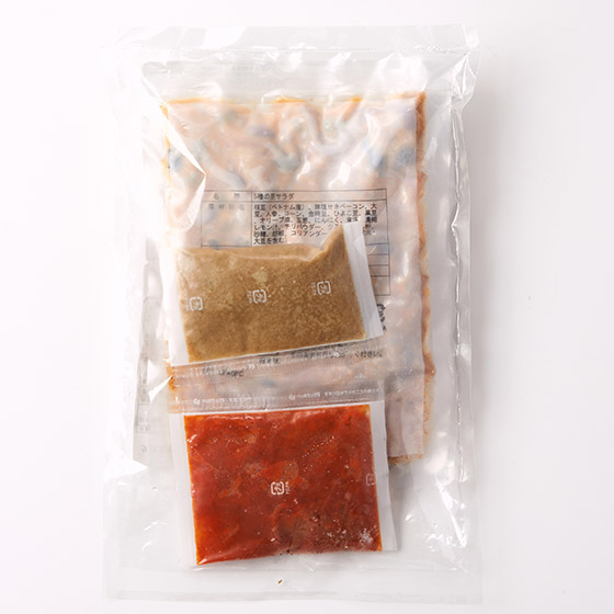 | 原材料 | 【豚肉香味野菜炒め】豚肉(デンマーク産)、たまねぎ、人参、セロリ、しょうが、こめ油、食塩、おろしにんにく、酵母エキス、こしょう、(一部に豚肉を含む)【5種の豆サラダ】枝豆(ベトナム産)、無塩せきベーコン、大豆、人参、コーン、金時豆、ひよこ豆、黒豆、オリーブ油、玉葱、にんにく、食塩、濃縮レモン汁、チリパウダー、クミン、でん粉、砂糖、胡椒、コリアンダー、(一部に乳製分・豚肉・大豆・ゼラチンを含む)【サルサ・ランチェラ(トマトソース)】玉葱(国産)、トマトペースト、にんにく、発酵調味料、オリーブオイル、砂糖、唐辛子、濃縮ライム果汁、食塩、でん粉、(一部に小麦を含む)【フレッシュサルサの素(サルサ・クルダ)】玉葱(国産)、にんにく、唐辛子、濃縮ライム果汁、オリーブオイル、砂糖、コリアンダー、クミン、食塩 |
