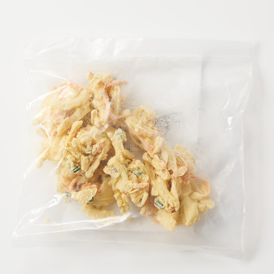 | 原材料 | 玉ねぎ(国産)、人参(国産)、さつまいも(国産)、いんげん(国産)、小麦粉、コーンフラワー、でん粉、小麦全粒粉、ぶどう糖、植物性たん白、衣(小麦粉、コーンフラワー、でん粉、小麦全粒粉、鶏卵、脱脂粉乳、えびパウダー、ぶどう糖、植物性たん白)、揚げ油(なたね油、パーム油)、(一部に卵・乳成分・小麦・えび・大豆を含む) 添加物:膨張剤、乳化剤、カロチン色素、クチナシ色素 |