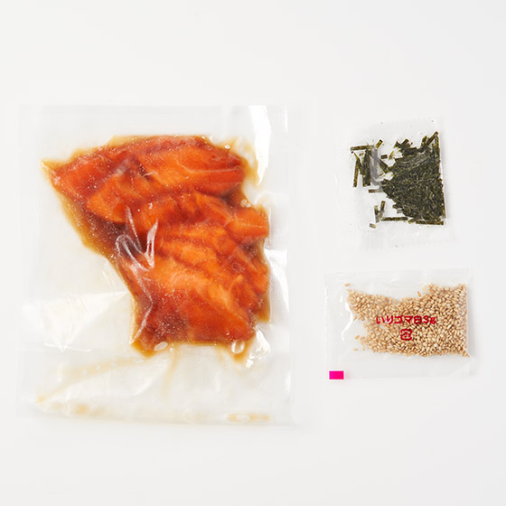 | 原材料 | トラウトサーモン(山梨県産・養殖)、醤油、みりん、清酒、砂糖、昆布エキス、酵母エキス、かつお節エキス、(一部に小麦・さけ・大豆を含む)【別添】いりごま(国内製造)(ごまを含む)、刻みのり(国産) |