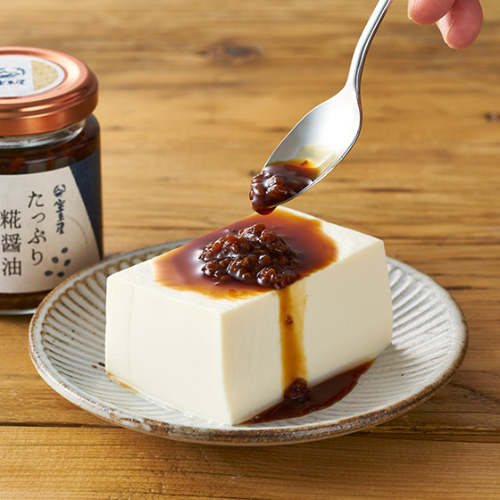 ■創業100余年の糀屋がつくった醤油こうじです。濃口醤油に「米糀」を入れてじっくり発酵・熟成させました。米糀が醸し出した「うま味」や、まろやかな「甘み」が特長です。
