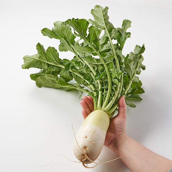 葉っぱがついた状態でお届けする大根です。大根自体はもちろん、葉っぱにも旨みたっぷり。鍋やみそ汁、炒め物でどうぞ。 |
