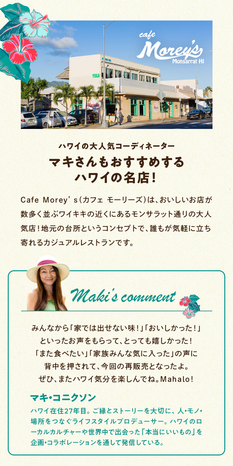ハワイの人気店、カフェモーリーズとのコラボメニュー!ほうれん草やマッシュルームなど様々な野菜に、特製ガーリックだれや野菜ブイヨン、ナンプラーなどの旨み調味料を掛け合わせました。バターのまろやかさも引き立つ、ハワイ料理ならではのフライドライスをめしあがれ。