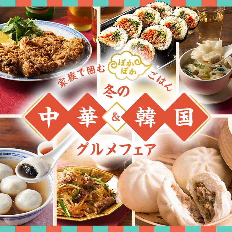 ごま油香る本格キンパ。カリもち海鮮チヂミはいか、たこと野菜がたっぷり、フライパンで焼けば外はカリッと中はもっちり食感に。牛肉チャプチェは国産の春雨とにんじん、牛肉、きくらげ入り、もやしとニラを加えて炒めるだけで、ごはんがすすむ一品が完成!